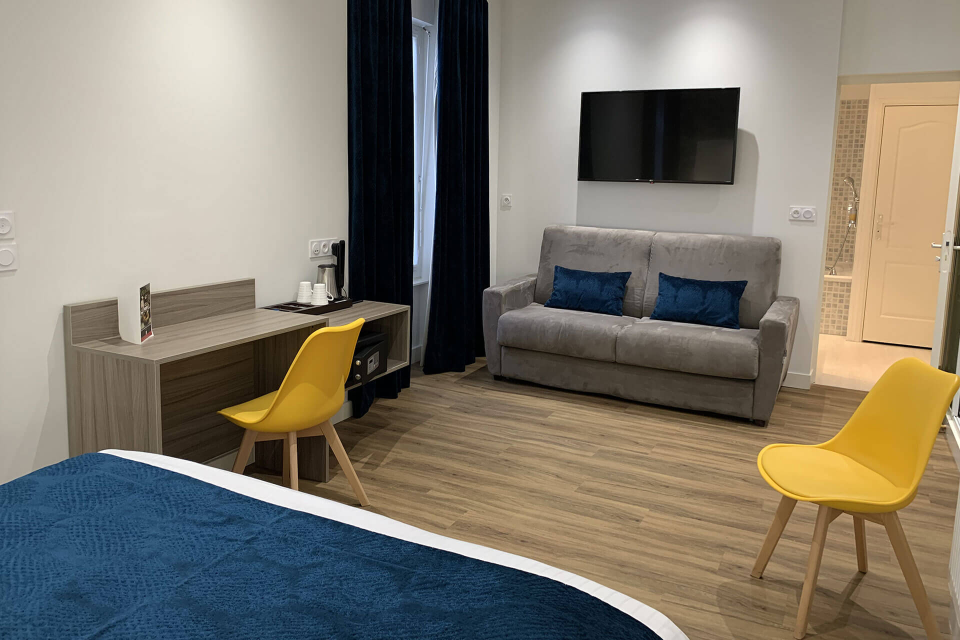 Décoration contemporaine et grand écran plasma .Cette chambre est faites pour recevoir une famille avec deux enfants qui occuperons le canapé lit très cosy.
